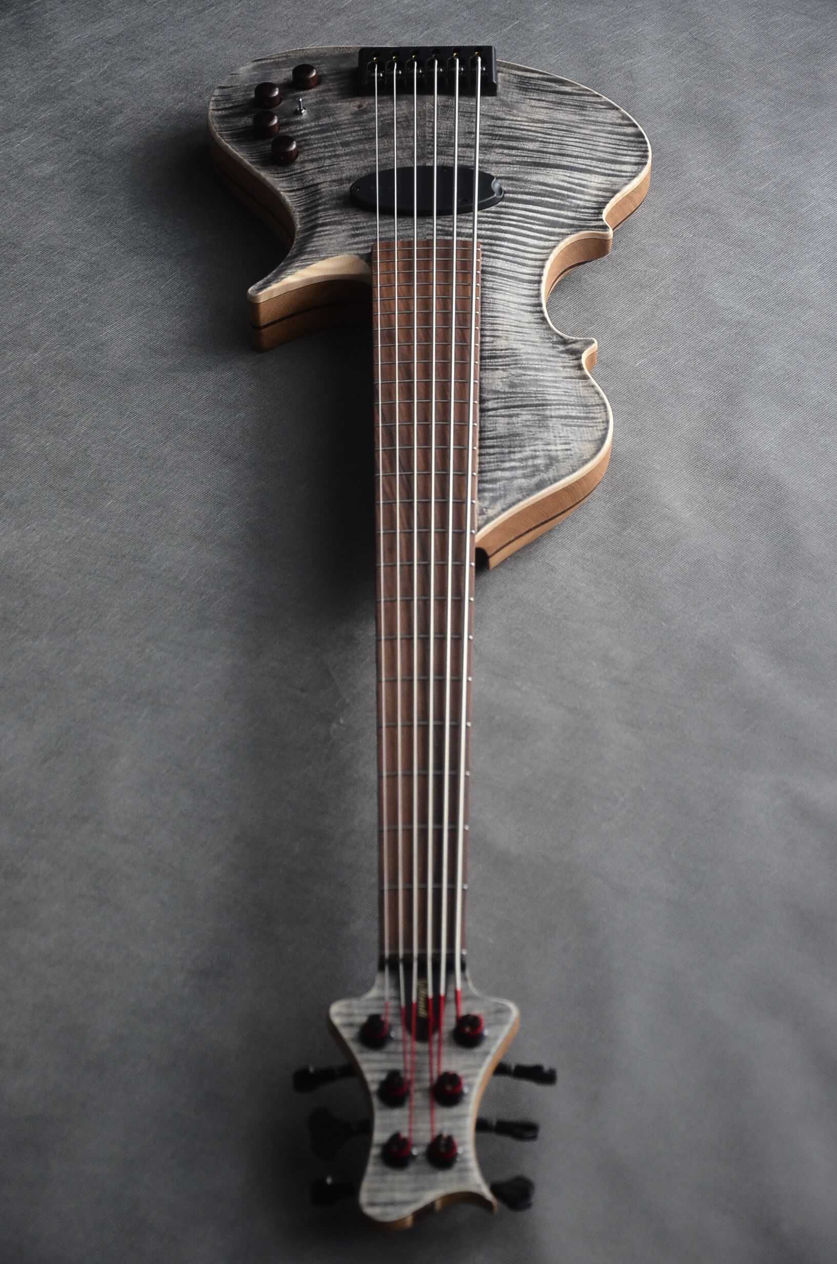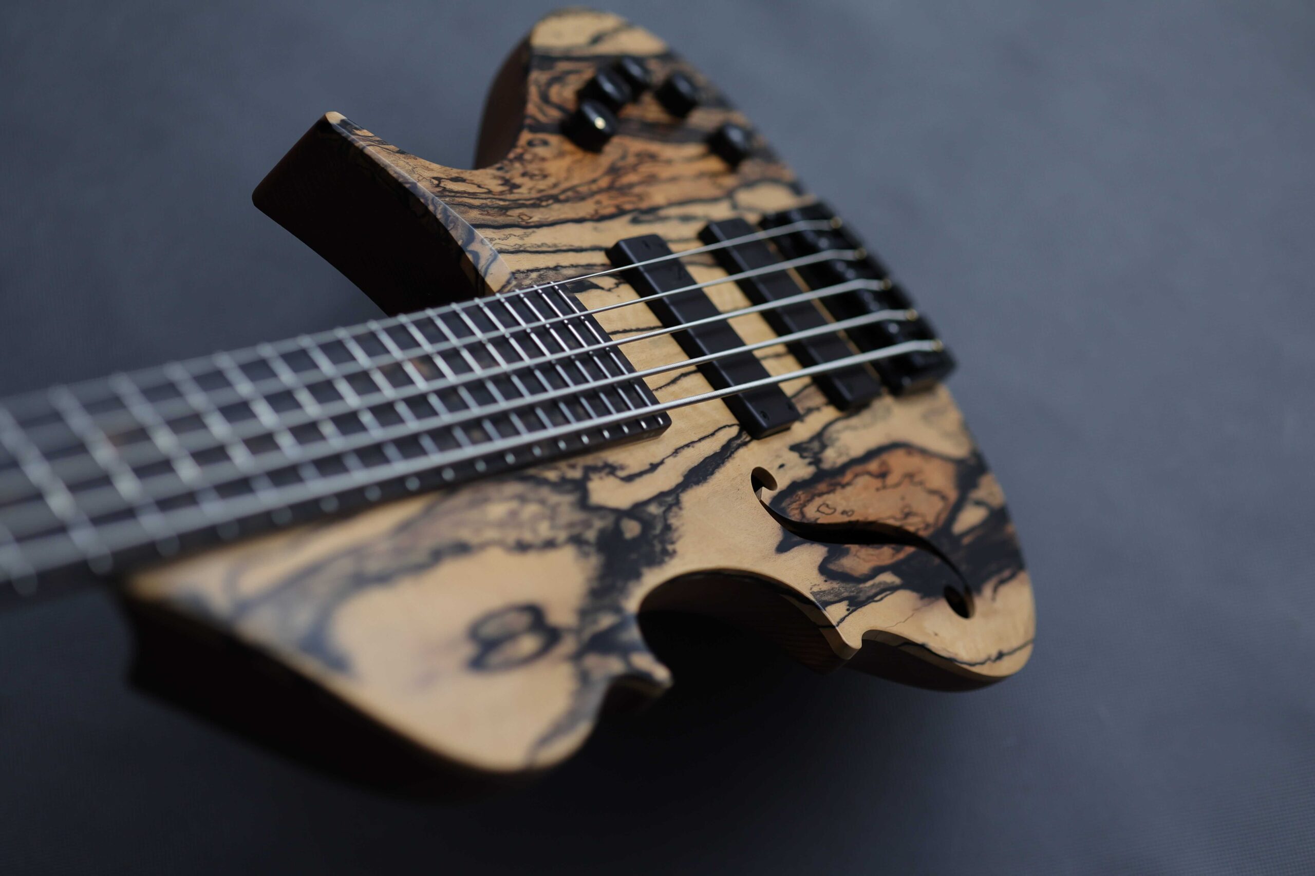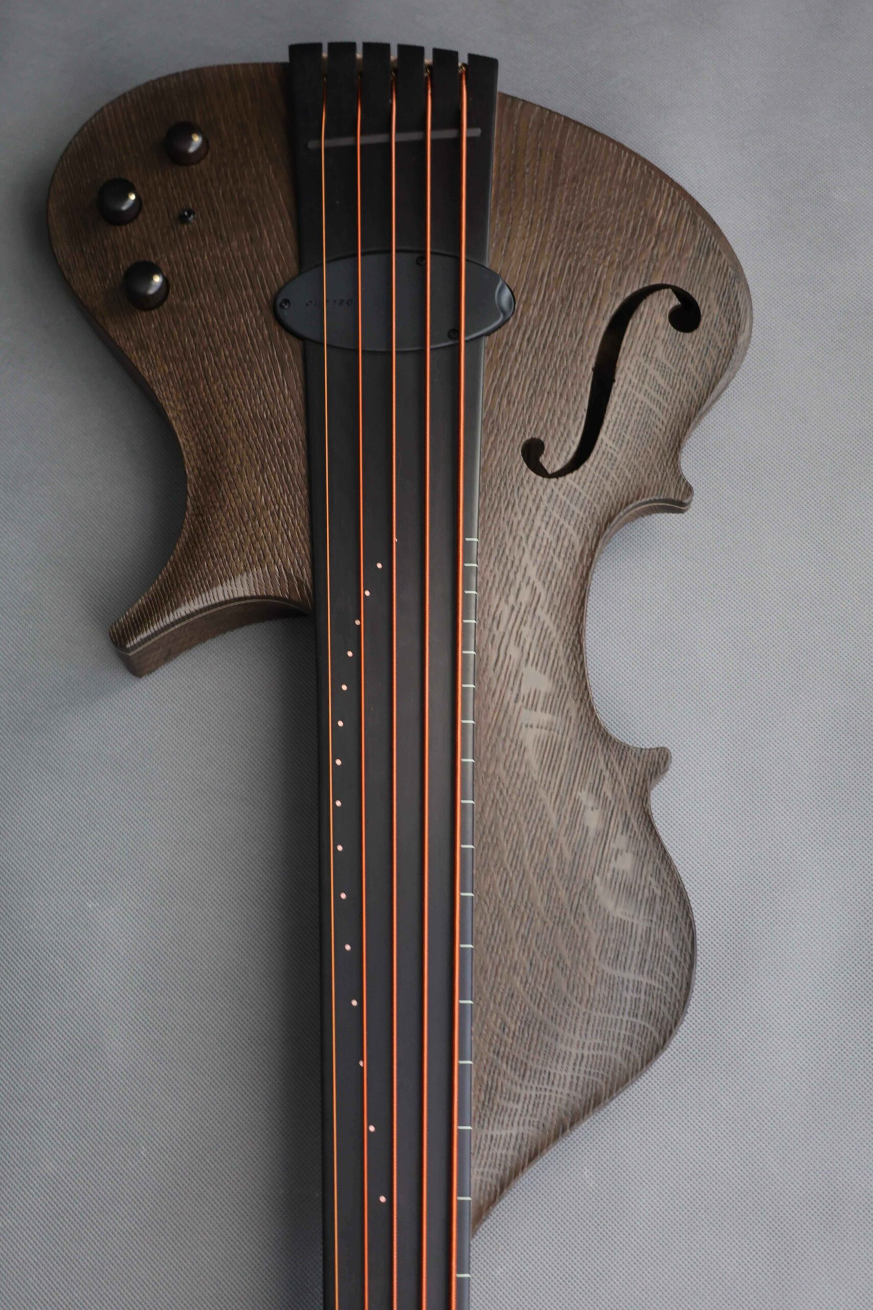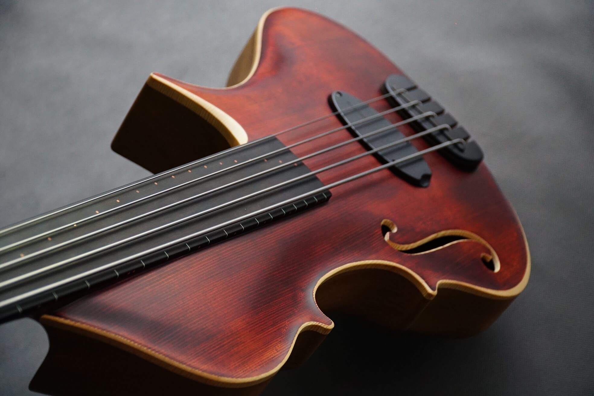 The Hane Bass — carved from a single piece of solid oak that acts as a resonant soundboard, with a Spanish cedar neck reinforced by titanium and carbon fiber for stability and sustain. Its pale moon ebony fingerboard and bridge add clarity and warmth, while the passive piezo and Hathor magnetic pickups blend natural acoustic depth with defined electric presence