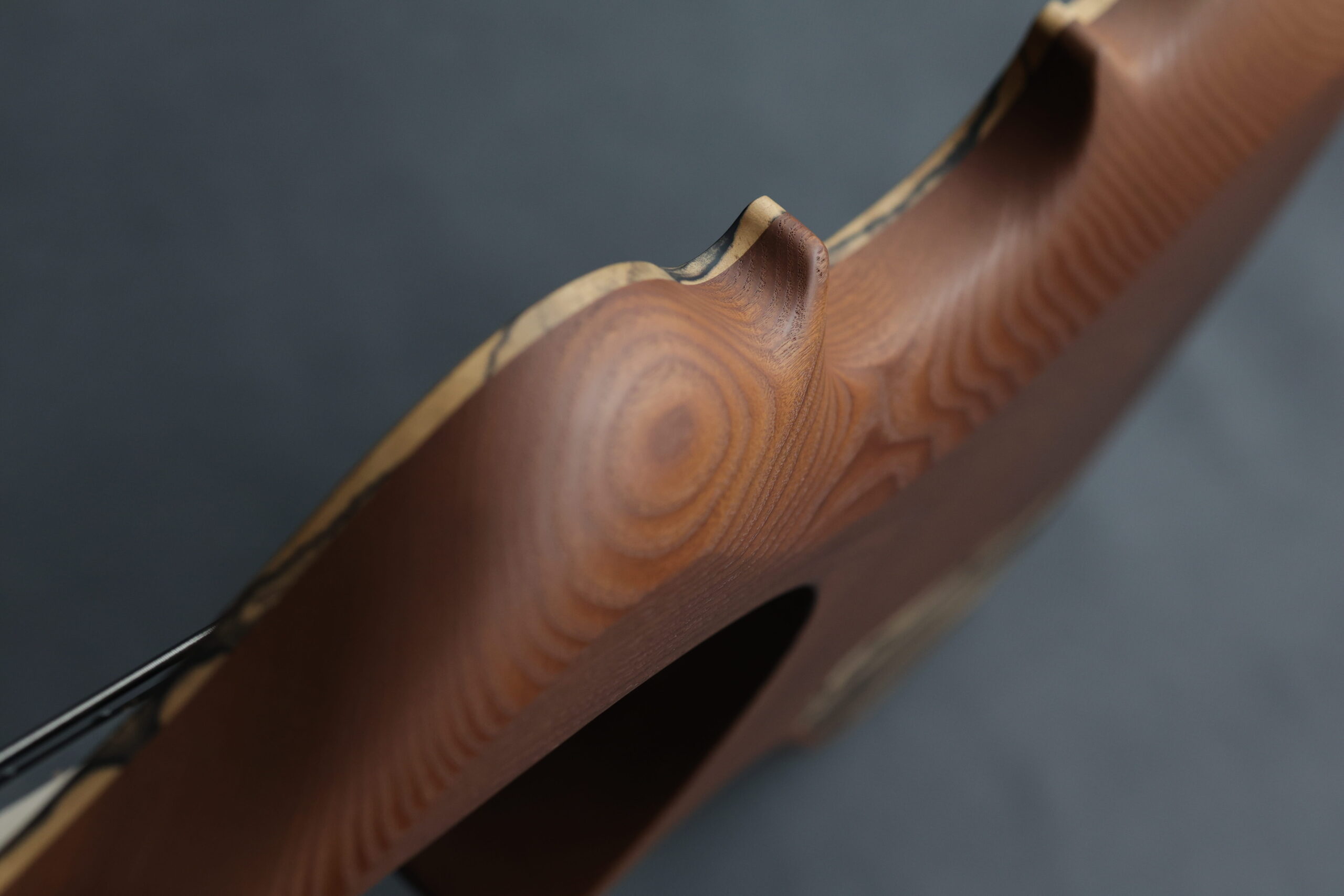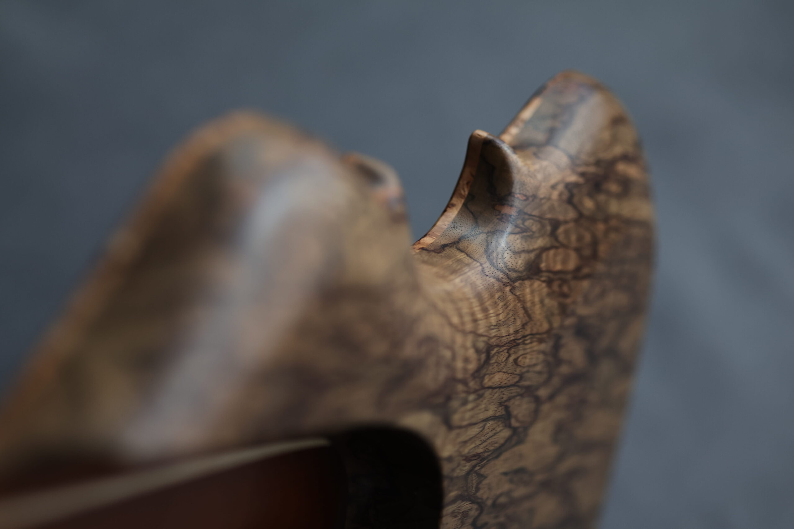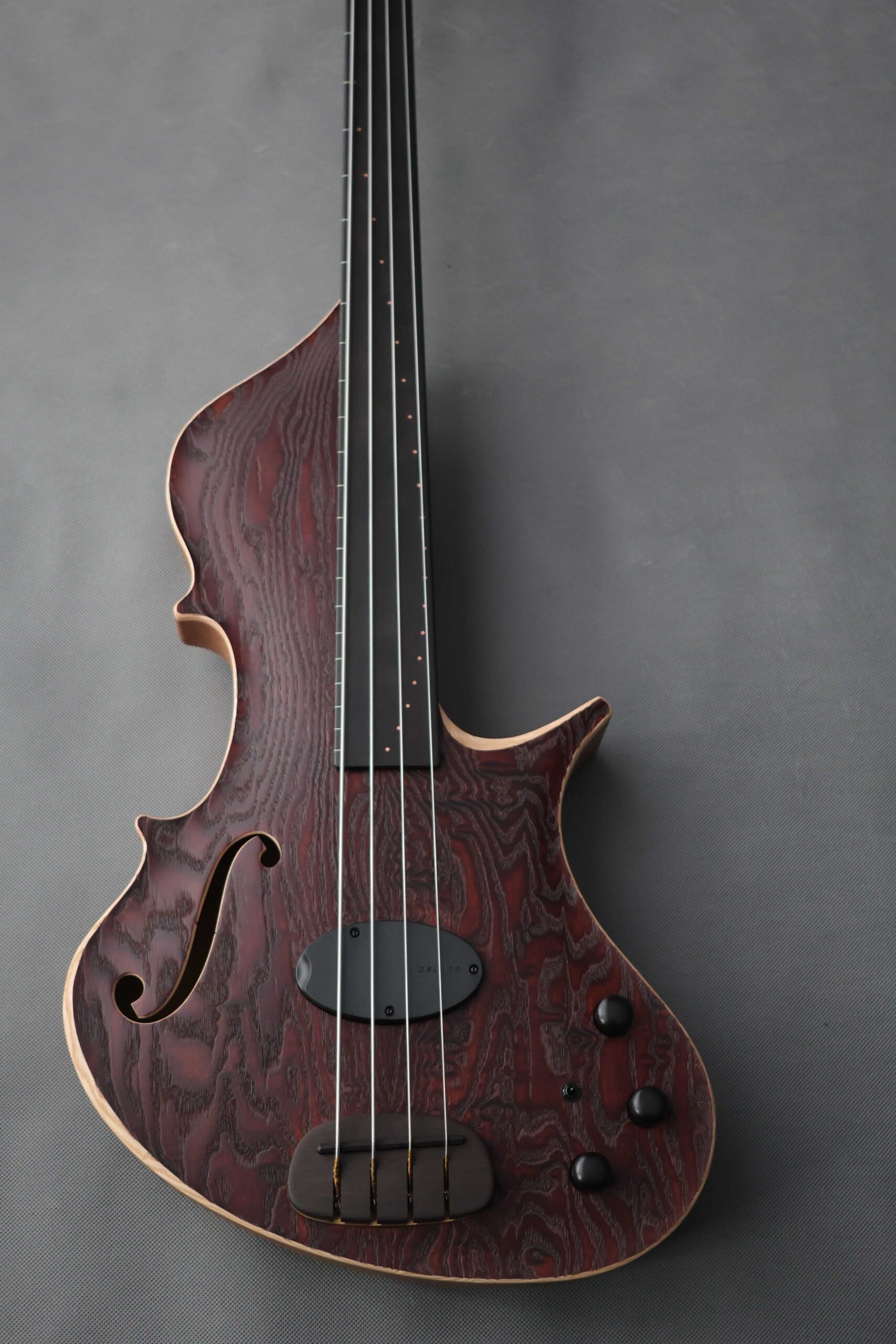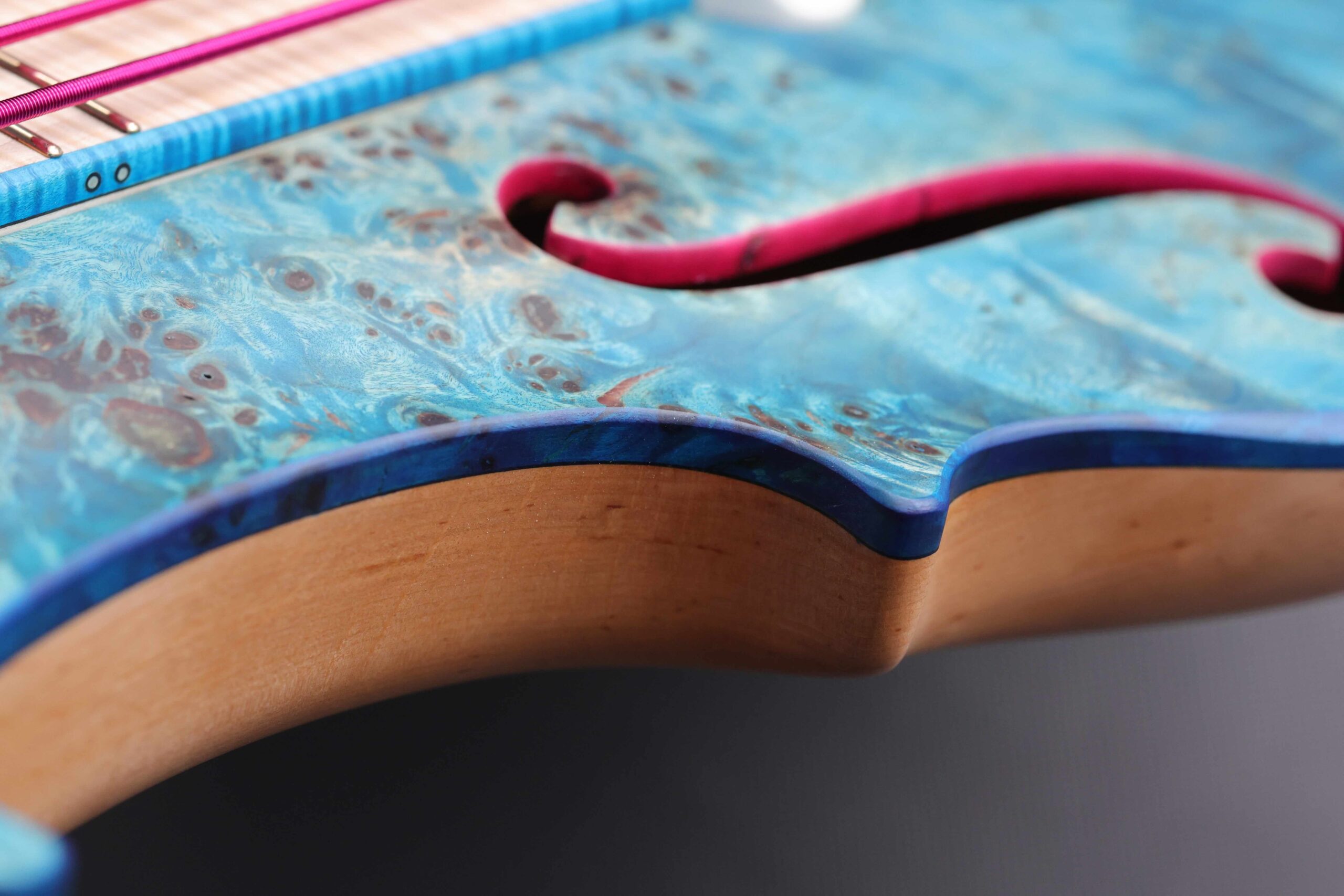 The Hane Bass — carved from a single piece of solid oak that acts as a resonant soundboard, with a Spanish cedar neck reinforced by titanium and carbon fiber for stability and sustain. Its pale moon ebony fingerboard and bridge add clarity and warmth, while the passive piezo and Hathor magnetic pickups blend natural acoustic depth with defined electric presence