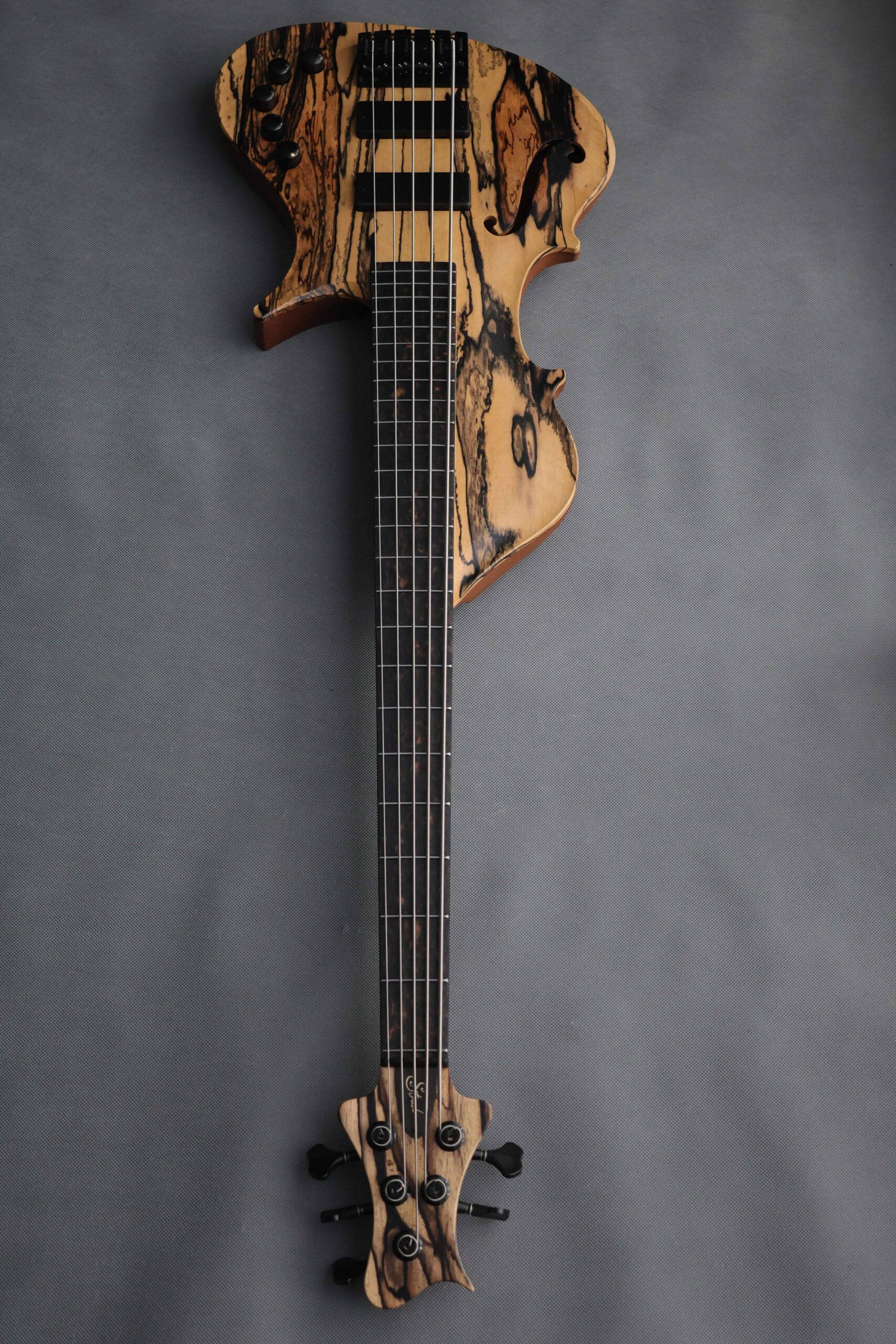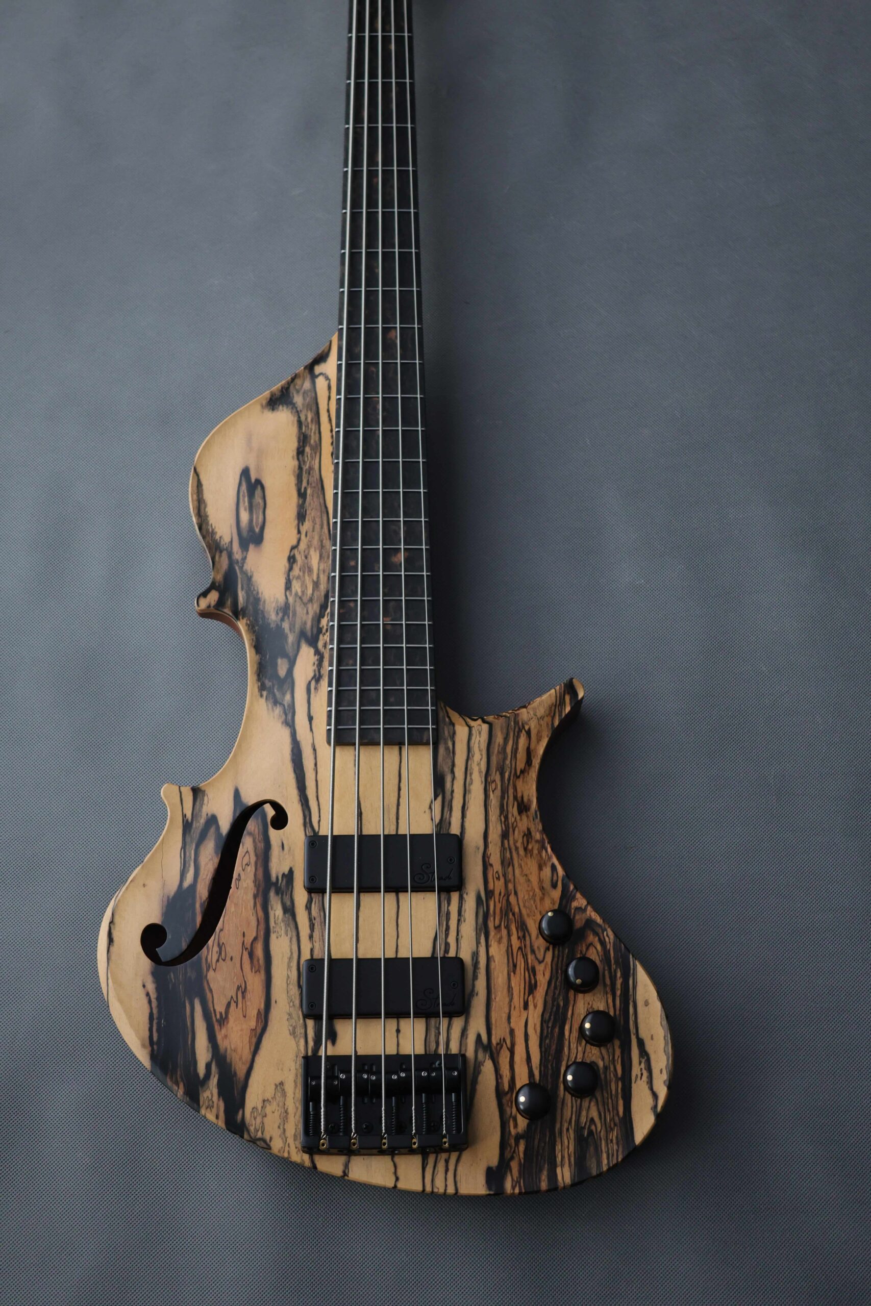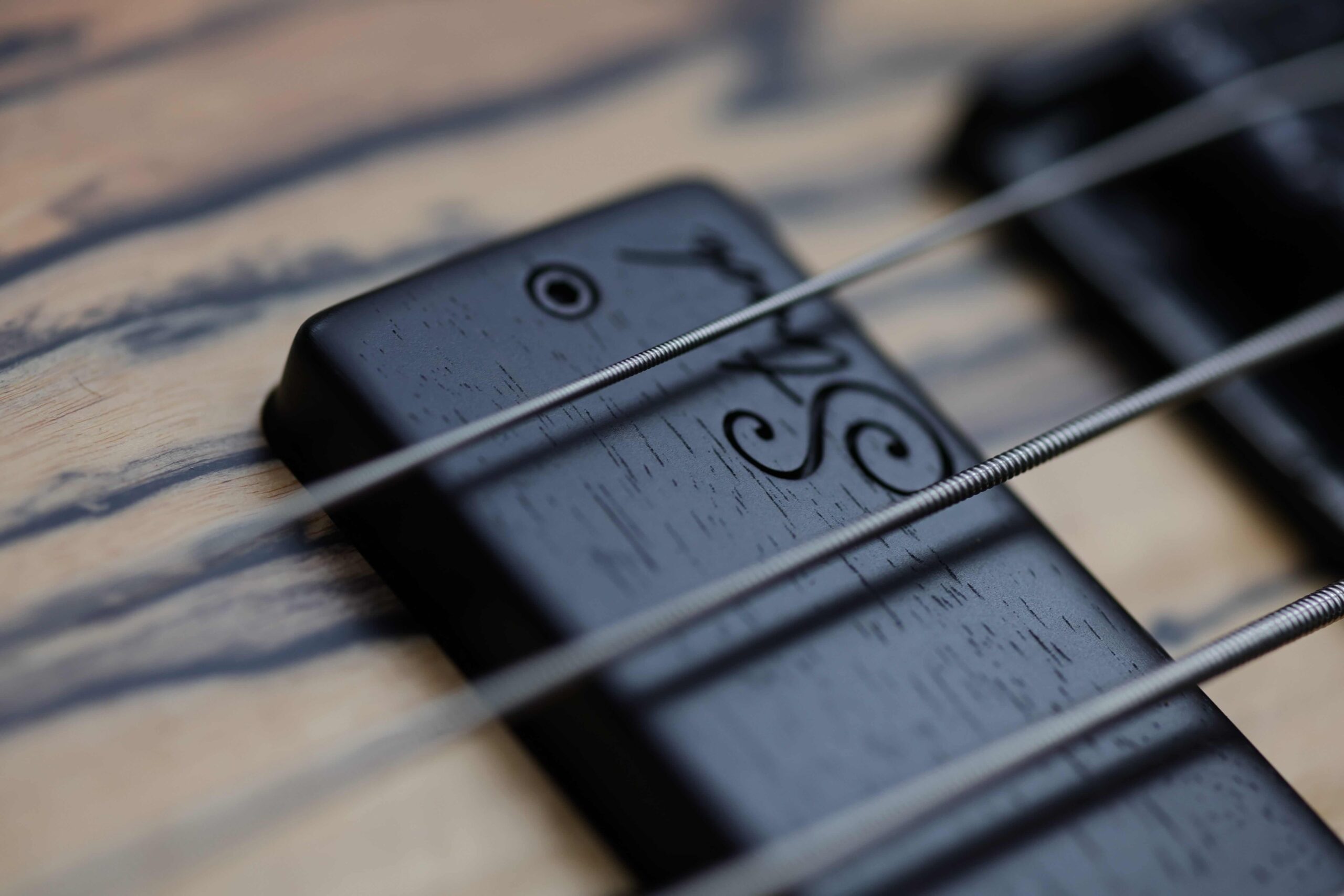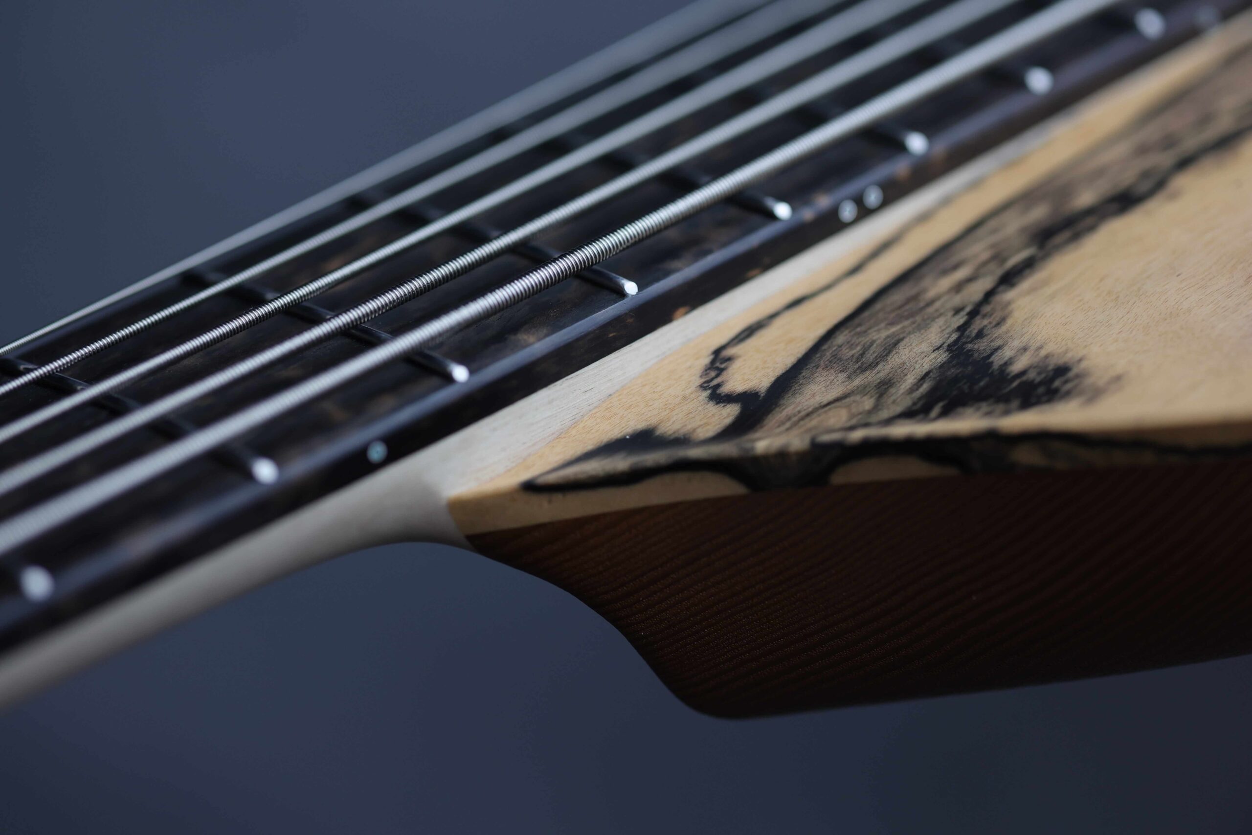 This first project is a celebration of ebony in all its forms, enriched with a distinctive local accent. The chambered body is carved from a single piece of roasted ash sourced from the Polish mountains—light, resonant, and full of character—while the neck is crafted from one-piece flamed hornbeam, the hardest European wood, chosen for its strength and clarity. Reinforced with carbon fiber tubes and guided by a titanium truss rod, the structure is ultra-stiff, delivering a tight, focused response with exceptional sustain.